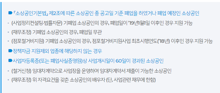 ▶ 『소상공인기본법』 제2조에 따른 소상공인 중 공고일 기준 폐업을 하였거나 폐업 예정인 소상공인