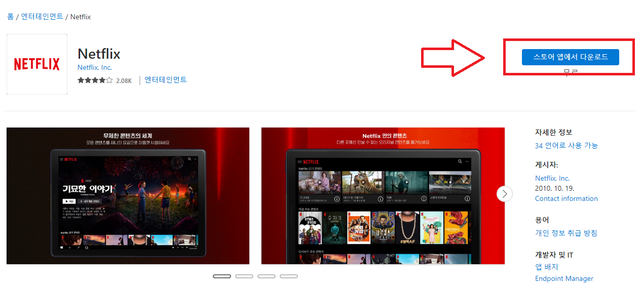 오른쪽 위의 스토어 앱에서 다운로드 버튼을 누르시면 넷플릭스 pc버전을 다운로드 하실 수 있습니다.