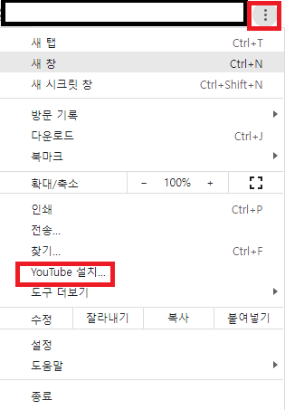 유튜브 사이트에 들어간 후에 크롬 브라우저에서 오른쪽 위에 있는 점 세 개를 클릭하시고 YouTube 설치 메뉴를 누르시면 아주 빠르게 유튜브 pc버전이 설치되고, 바탕화면에 아이콘이 생깁니다.