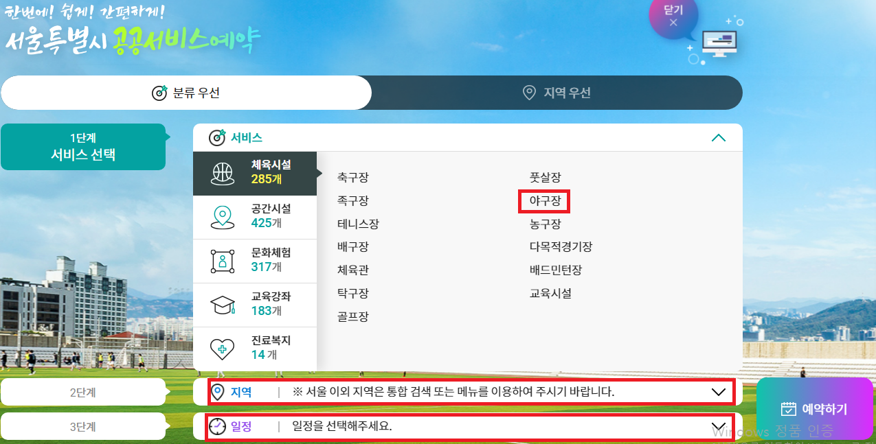 서비스 종류, 지역, 일정을 차례차례로 선택 후에 예약하기 버튼을 눌러주세요.