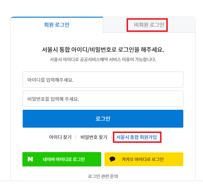 비회원 로그인으로도 이용할 수 있지만, 서울시 통합 회원가입을 통해서 서울시에서 제공하는 많은 서비스를 이용할 수 있으니 통합 회원가입을 추천드립니다.