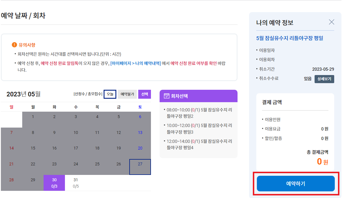 4. 예약 시작 시간에 예약하기 버튼이 활성화되므로 타이밍이 중요합니다.