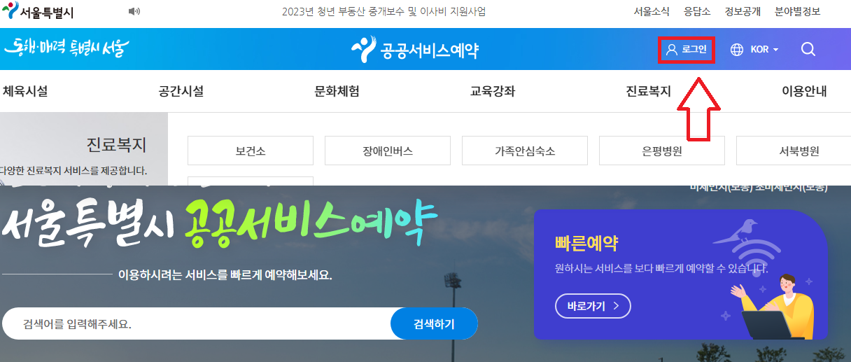 서울시 공공서비스 예약은 회원가입이 필요합니다. 로그인 버튼을 누르시면 로그인 화면으로 이동하고 로그인 화면에서 회원가입 메뉴를 선택할 수 있습니다.