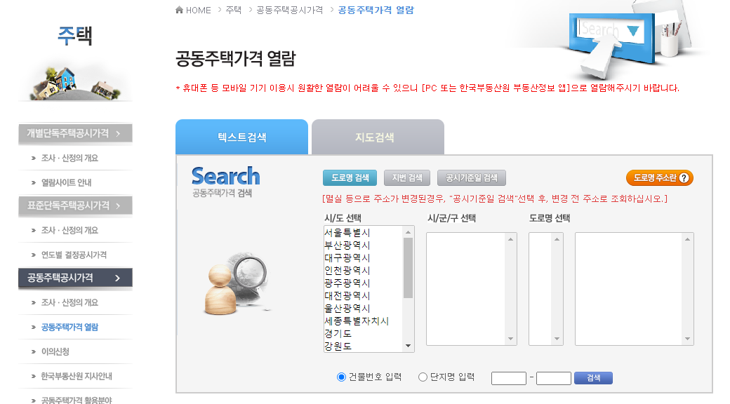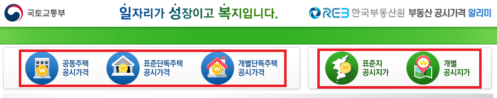 첫 화면의 위쪽에서 왼쪽 3개 메뉴는 주택 공시가격 조회, 오른쪽 2개 메뉴는 토지 공시지가 조회입니다.