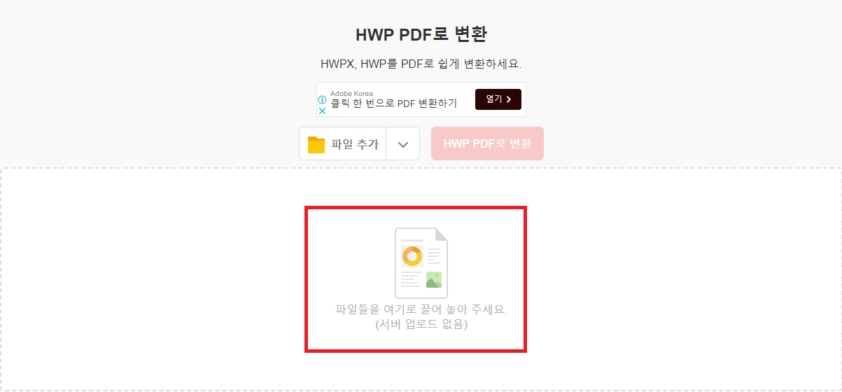 가운데 하얀 칸에 hwp pdf 변환을 원하는 hwp 파일을 올려줍니다.